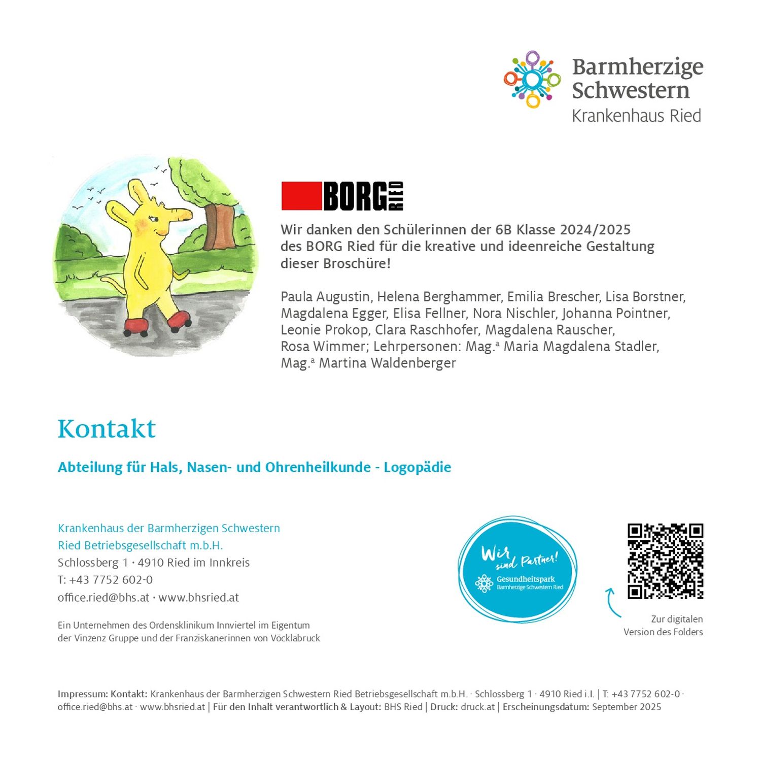 Im Rahmen eines besonderen Schulprojekts haben die Schülerinnen der 7B (Gruppe KUGE Stad) letztes Jahr ein liebevoll gestaltetes Kinderbuch illustriert, das künftig in der Logopädieabteilung der HNO-Abteilung des Krankenhauses Ried im Innkreis zum Einsatz kommt.