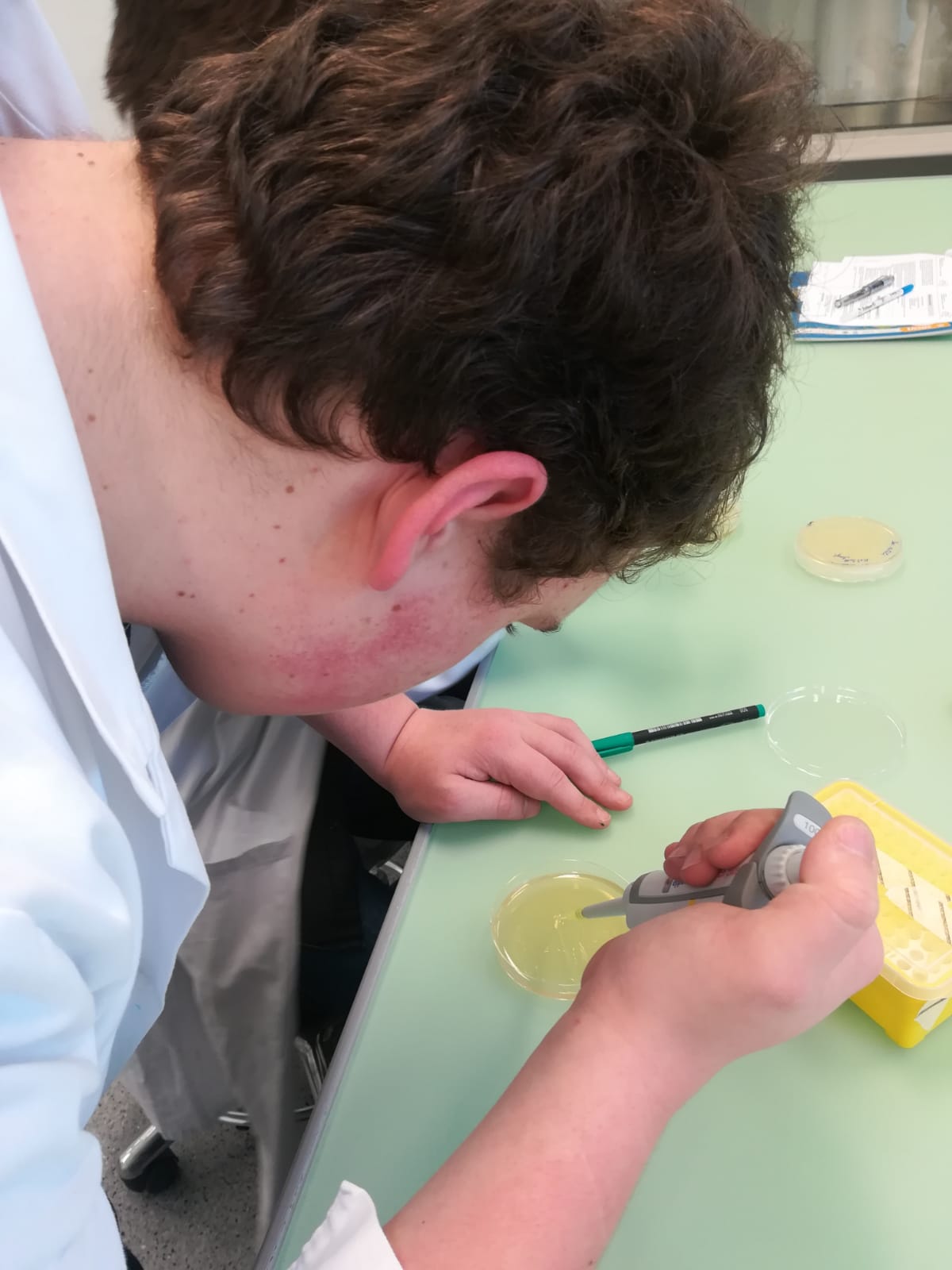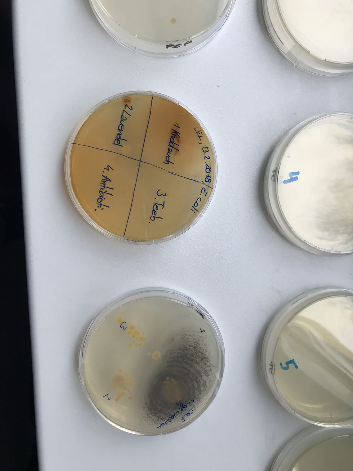 Ausgerüstet mit der grundlegenden Theorie, durften wir im Februar unser Wissen praktisch im OpenLab in Wels anwenden. Zuerst isolierten wir auf speziellen Agarplatten Keime, die sich auf unseren Händen und in der Luft befanden. Diese Platten nahmen wir mit und werteten sie etwas später – Bakterien benötigen Zeit um zu wachsen – in der Schule aus. Weiters führten wir einen Agardiffusionstest durch: Hier soll das Resistenzverhalten von Testkeimen gegenüber verschiedenen Antibiotika untersucht werden. Wir verwendeten dafür mehrere Hausmittel mit antibiotischer Wirkung wie Knoblauch, Lavendel, Teebaumöl.